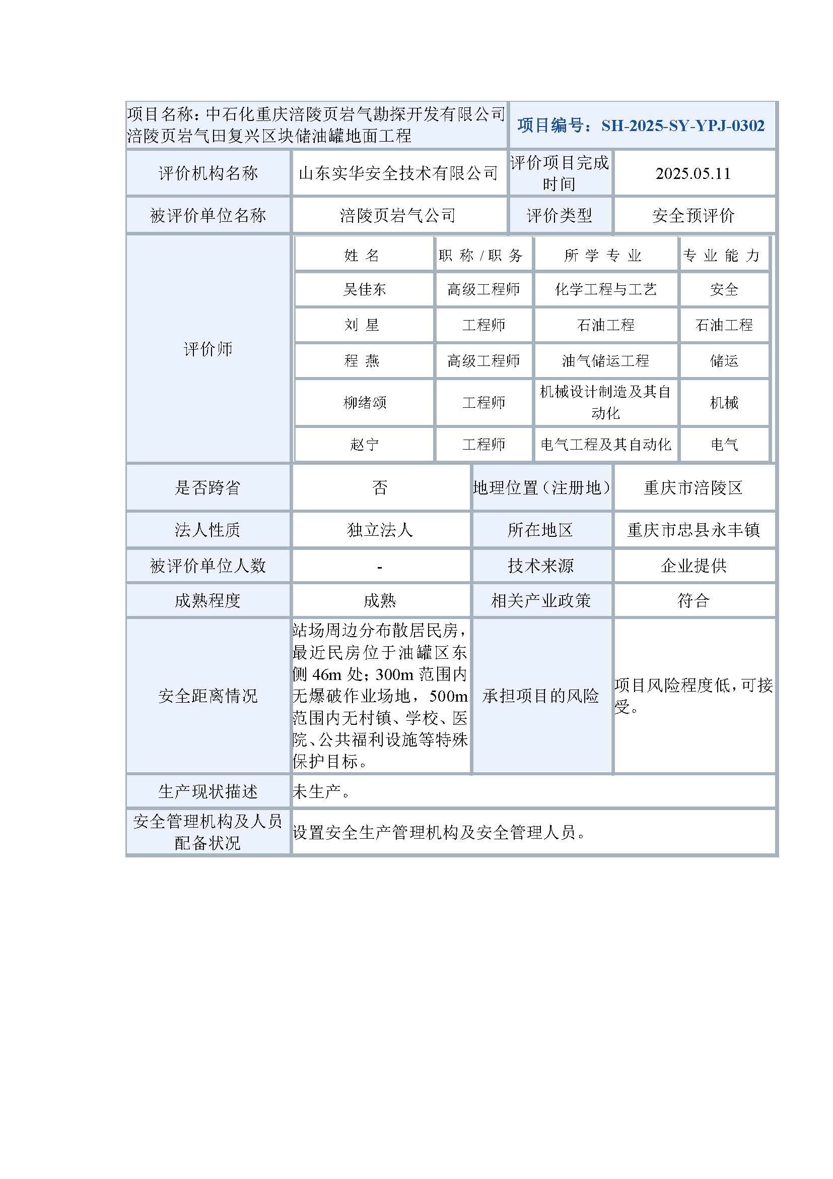 中石化重慶涪陵頁巖氣勘探開發(fā)有限公司涪陵頁巖氣田復(fù)興區(qū)塊儲(chǔ)油罐地面工程安全預(yù)評(píng)價(jià)