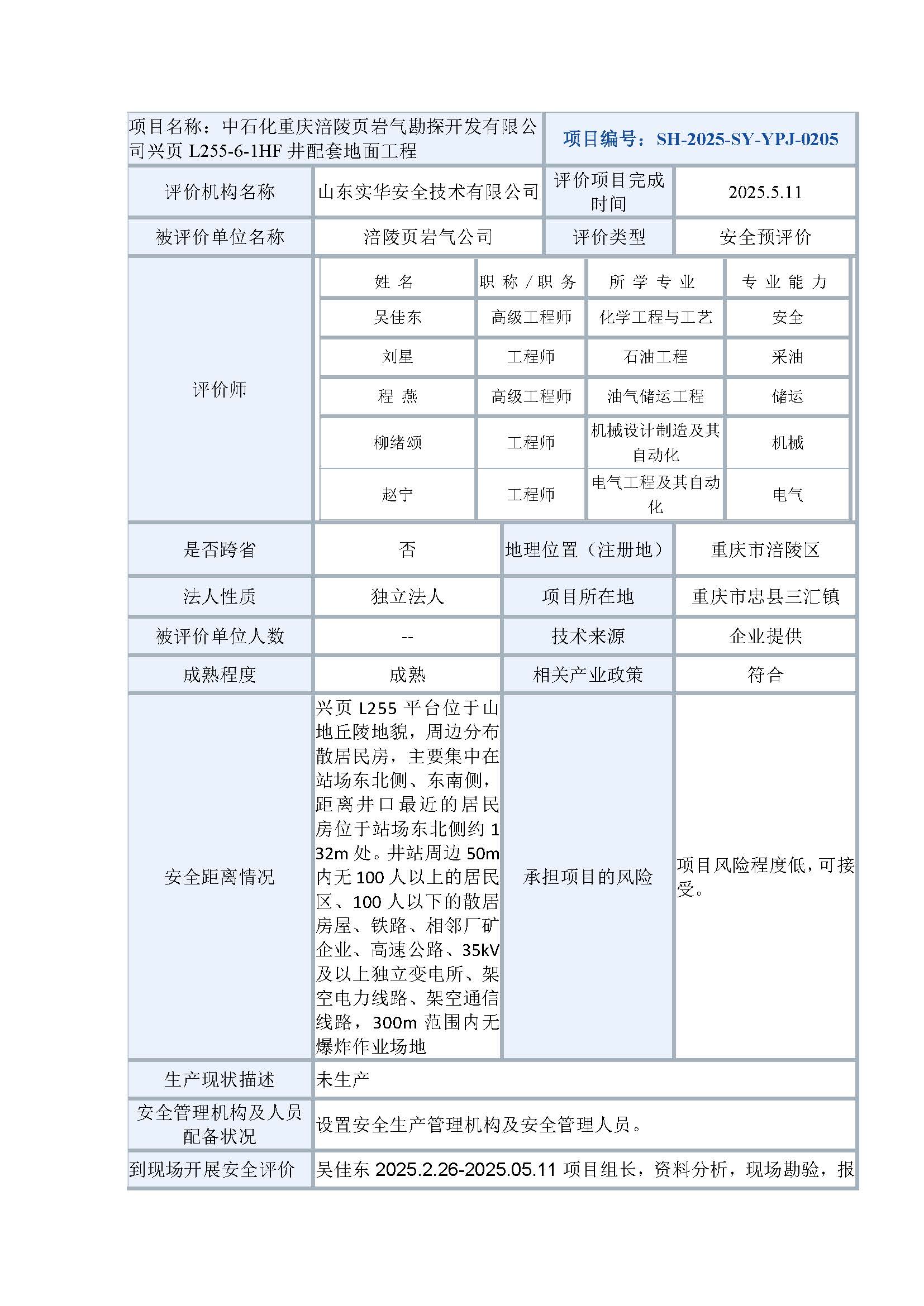 中石化重慶涪陵頁(yè)巖氣勘探開(kāi)發(fā)有限公司興頁(yè)L255-6-1HF井配套地面工程安全預(yù)評(píng)價(jià)