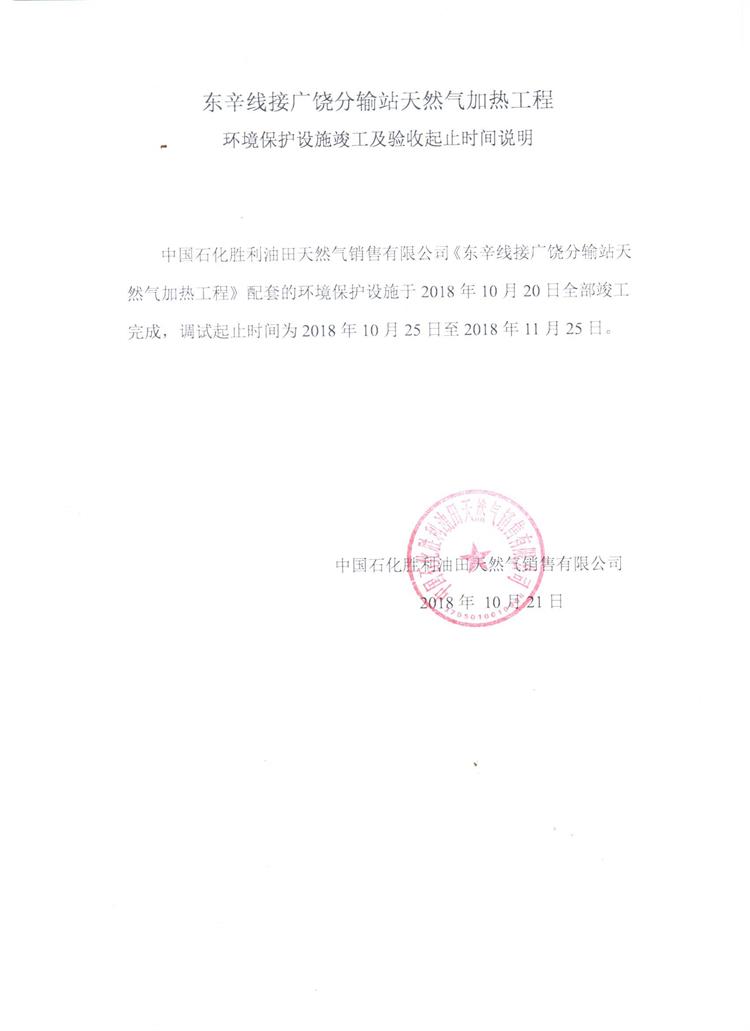 東辛線接廣饒分輸站天然氣加熱工程環(huán)境保護設(shè)施竣工及驗收起止時間說明