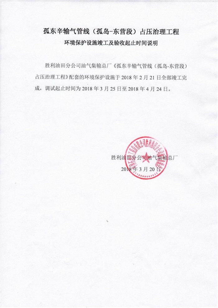 孤東辛輸氣管線(孤島-東營段)占壓治理工程環(huán)境保護設施竣工及驗收起止時間說明