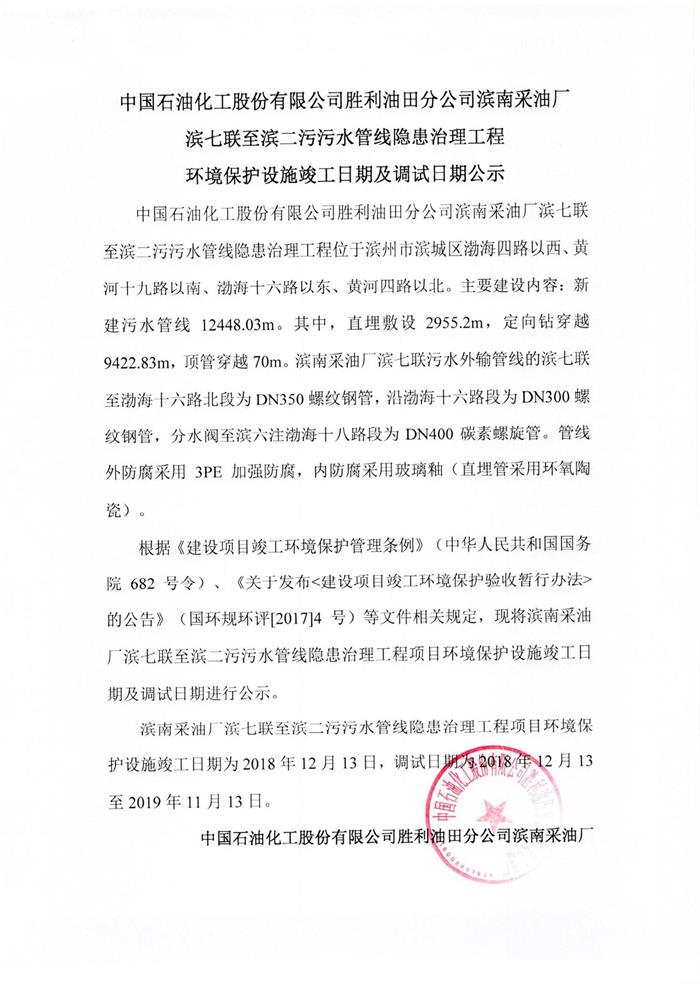 中國石油化工股份有限公司勝利油田分公司濱南采油廠濱七聯(lián)至濱二污污水管線隱患治理工程環(huán)境保護設(shè)施竣工日期及調(diào)試日期公示