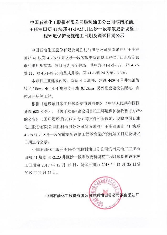 中國石油化工股份有限公司勝利油田分公司濱南采油廠王莊油田鄭41塊41-2×23井區(qū)沙一段零散更新調(diào)整工程環(huán)境保護設(shè)施竣工日期及調(diào)試日期公示
