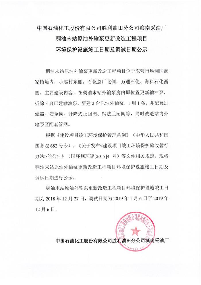 中國石油化工股份有限公司勝利油田分公司濱南采油廠稠油末站原油外輸泵更新改造工程項目環(huán)境保護設(shè)施竣工日期及調(diào)試日期公示