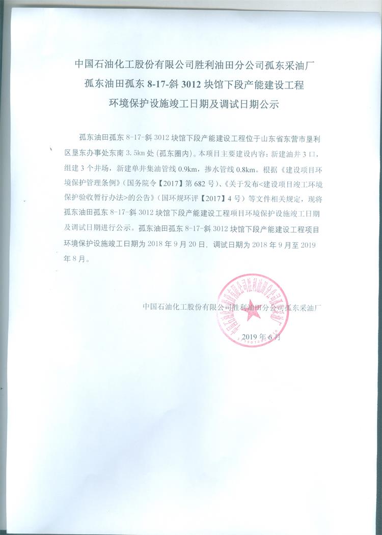 中國石油化工股份有限公司勝利油田分公司孤東采油廠孤東油田孤東8-17斜3012塊館下段產(chǎn)能建設(shè)工程環(huán)境保護設(shè)施竣工日期及調(diào)試日期公示